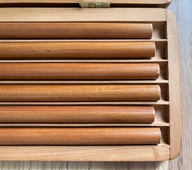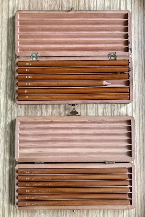 Turning to the pencils themselves, the box is not too dissimilar to the Hogarth & Hayes set featured in this post, however, the exterior does not have quite as thick a lacquer as that set. The Hogarth & Hayes set has inlayed hinges, whereas they are surface mounted here with the Cumberlands.