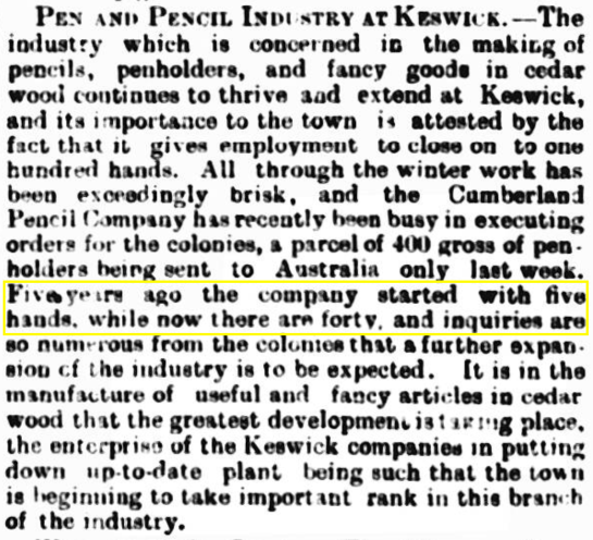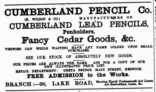 The article below from the 2 February 1904 edition of the Carlisle Journal helps confirm the story. The Cumberland Pencil Co started 5 years ago, so we can take that as early 1899.