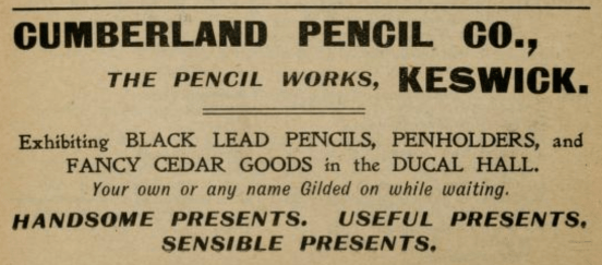 The advert below from the English Lakes Visitors of 13 September 1902 also makes reference to having your name gilded upon purchases. Also note the ‘(R. Wilson & Co)’ branding below the ‘Cumberland Pencil Co’ name. This features on all advertisements for Thomas Wilson’s Cumberland Pencil Co that I have come across to date.