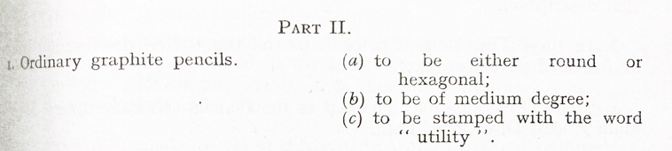 Part II gives us a breakdown of each ‘class’ of pencil allowed to be produced. This is the only place I could find formal confirmation of the difference between a ‘Utility’ pencil and a ‘War Drawing’ pencils. As you can see, the Utility pencils are a single grade, lower quality pencil for everyday use, whereas the ‘War Drawing’ is a higher quality pencil available in (limited) grades, for use in more professional settings.