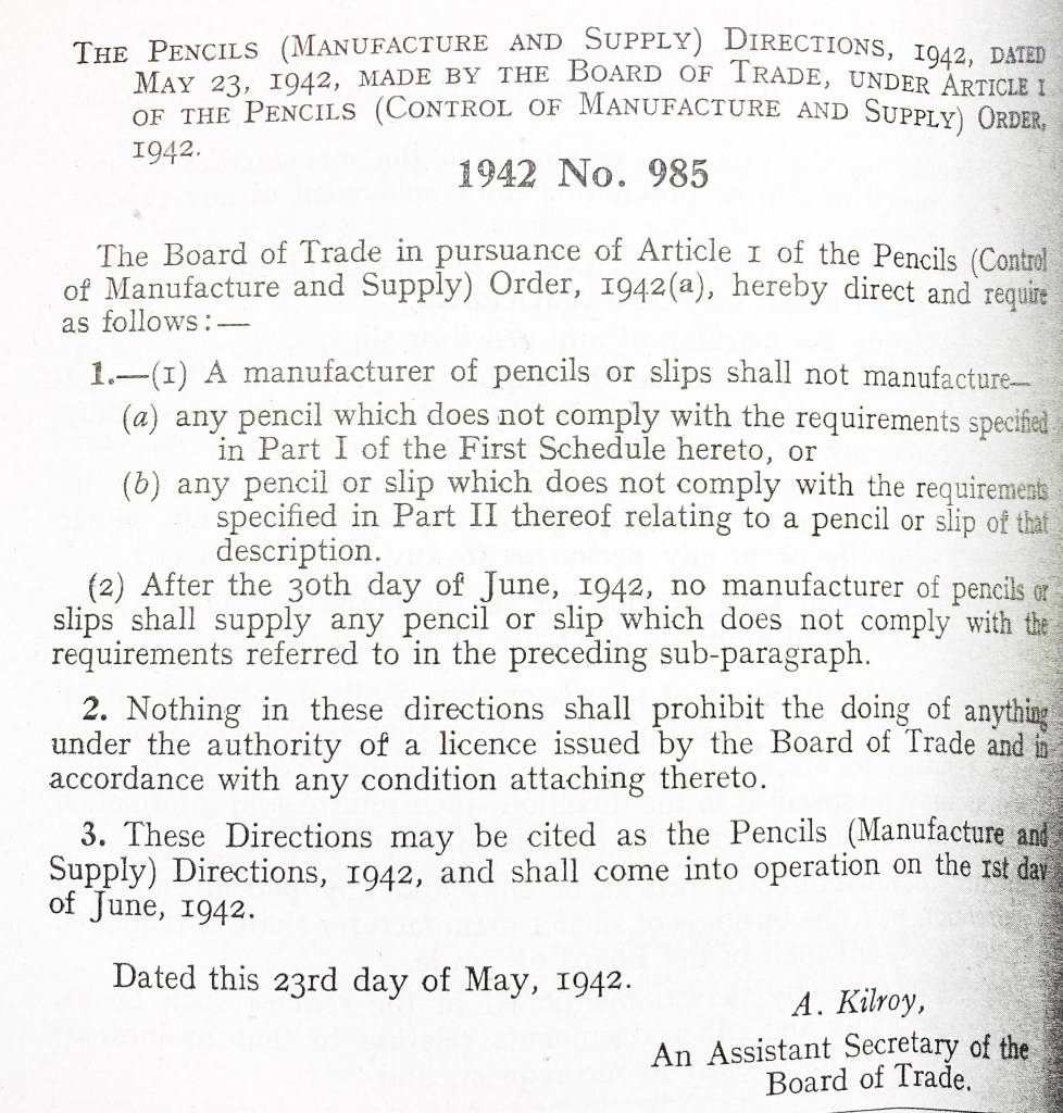 The Pencils (Control of Manufacture and Supply) Order, 1942, set strict rules on what pencil manufacturers could produce: