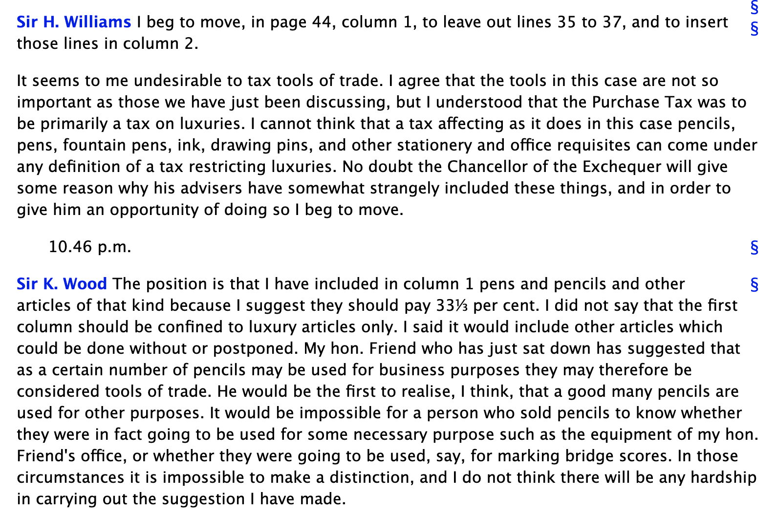 I’ve found that a really good source of information is to check Hansard for the discussions and debates that were taking place in Parliament as the various bills, orders, etc. worked their way through the system.The following exchange on the Finance (No. 2) Bill took place on 13 August 1940 (see: HC Deb 13 August 1940 vol 364 cc613-752). The idea of charging a Purchase Tax on pencils (and other stationery) was contested given that they could be seen to be ‘tools of the trade’ and not luxury items.