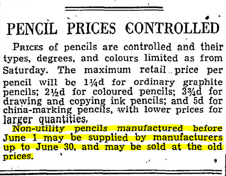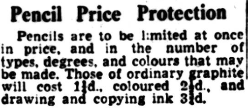 Not to be outdone, the Western Mail opted for their own piece of pencil alliteration the very next day. This article is interesting as it notes that old non restricted supplies could still be sold at original prices for a grace month.