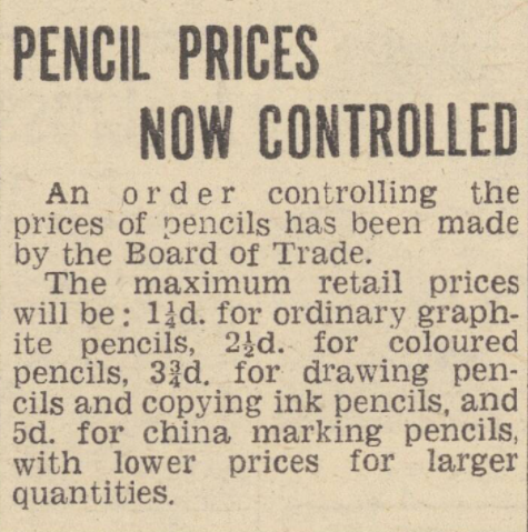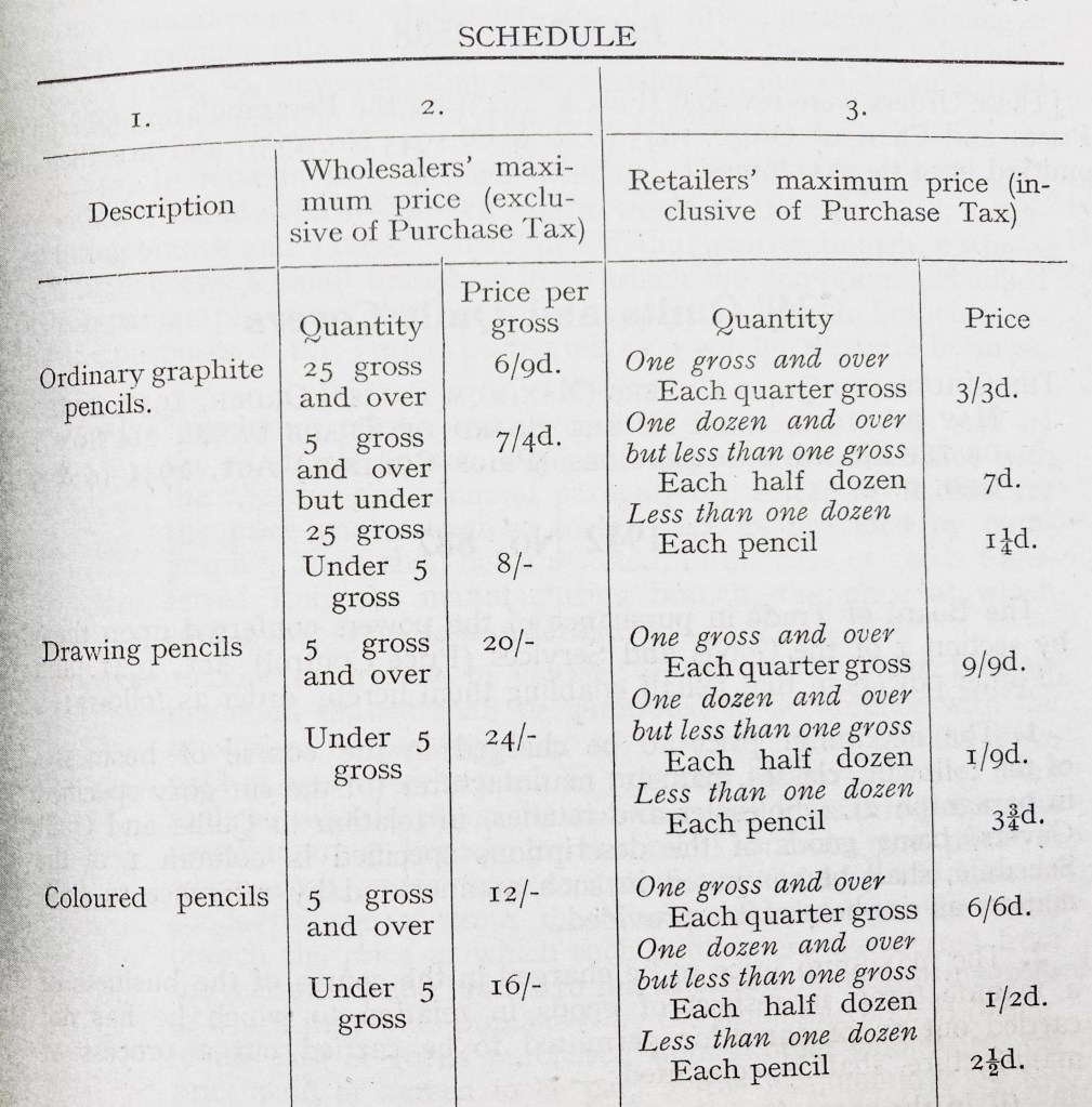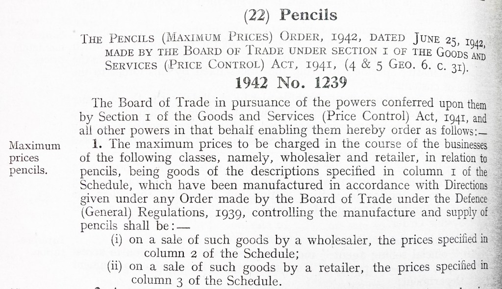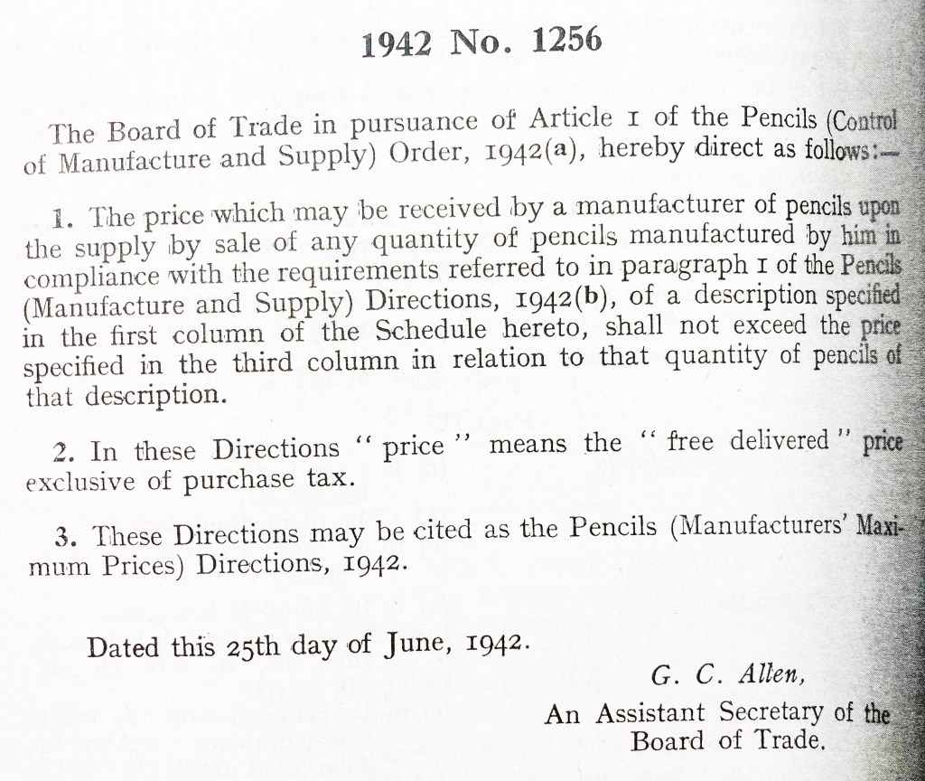The 1942 No 1265 Direction is an ancillary document to the Pencils (Control of Manufacture and Supply) Order 1942. It sets out the maximum pricing manufacturers could charge retailers.