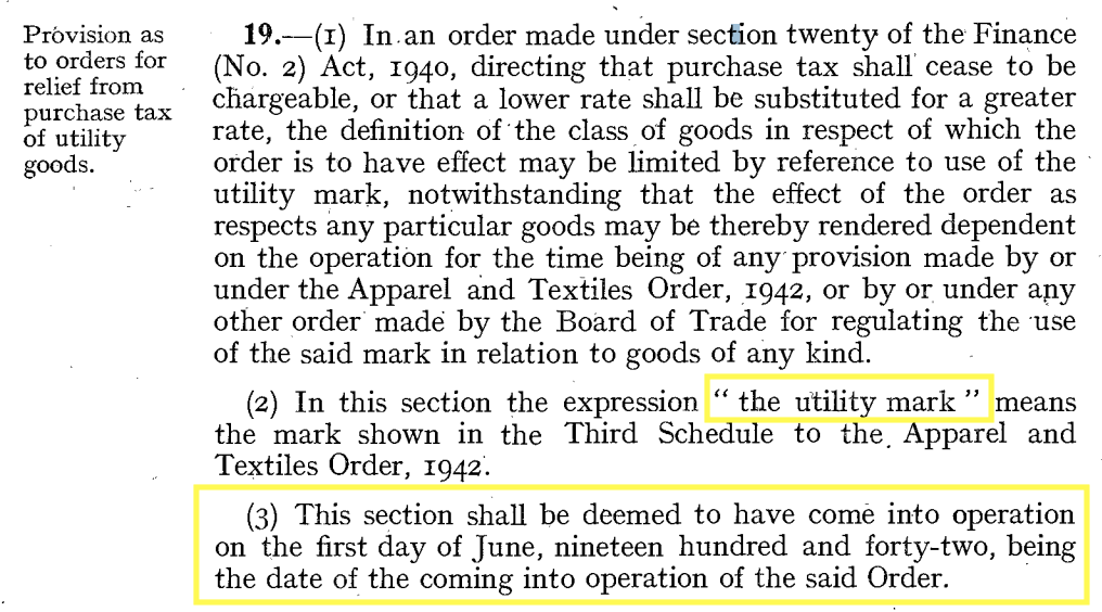 If we take a quick look at the Finance Act 1942, we can see that not only were Utility items required to display the CC41 Utility Mark, but they were also exempt from the Purchase Tax that was brought in under the earlier Finance Act.