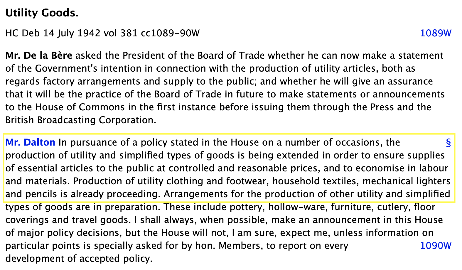 Lets take another look at Hansard. On 14 July Utility Goods were discussed in the Commons. Within HC Deb 14 July 1942 vol 381 cc1089-90W, we can see that, for some reason, pencils were selected as one of the first items to be included in the Utility scheme: