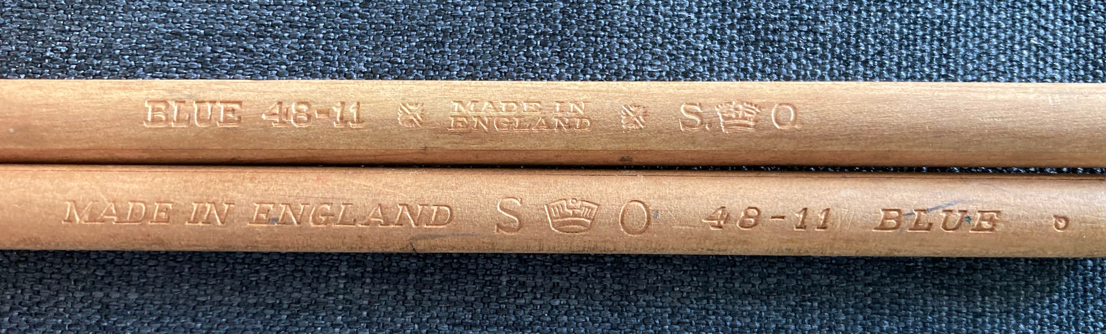 The colouring pencils below are further examples of wartime Stationery Office pencil. 48-11 was the Stationery Office code for blue colouring pencils and 48-14 was for red. As with all Stationery Office pencils, there is a slight caveat that they could actually post-date the regulations.