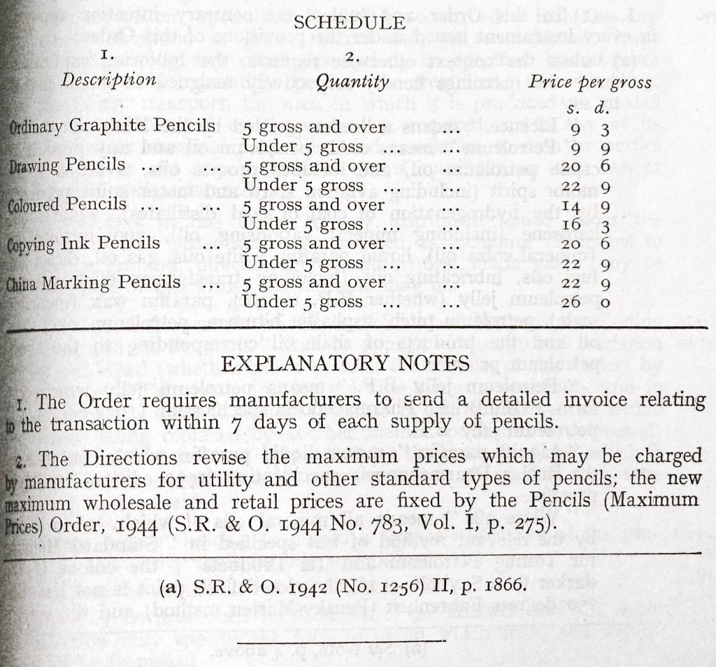 The Prices of Goods (Price-Regulated Goods) Order 1942 was the instrument that defined that pencils would fall under the rules set by the 1939 Act. It takes a bit of digging into the 1942 Order, so I’ve prepared an abridged version below: