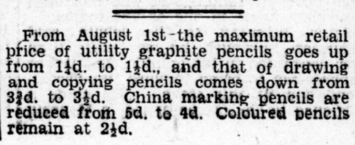 In August 1942, Utility Pencils pricing was the subject of a debate in the Commons. HC Deb 04 August 1942 vol 382 c862W recorded the discussion: