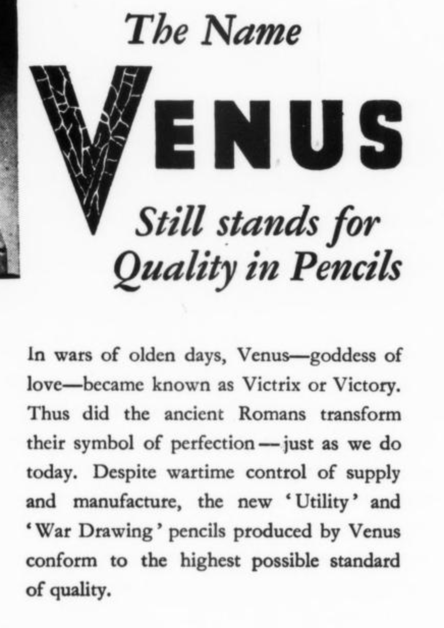 WWII advertising is always creative. This Venus example below gives a nice simplified explanation for pencil control necessity. I particularly liked the soldiers marching with pencils graphic.