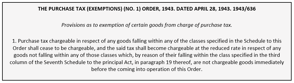 In addition to being price regulated goods, in 1943, all pencils were exempted from Purchase Tax due to the Purchase Tax (Exemptions) (No. 1) Order: