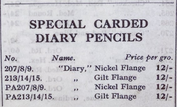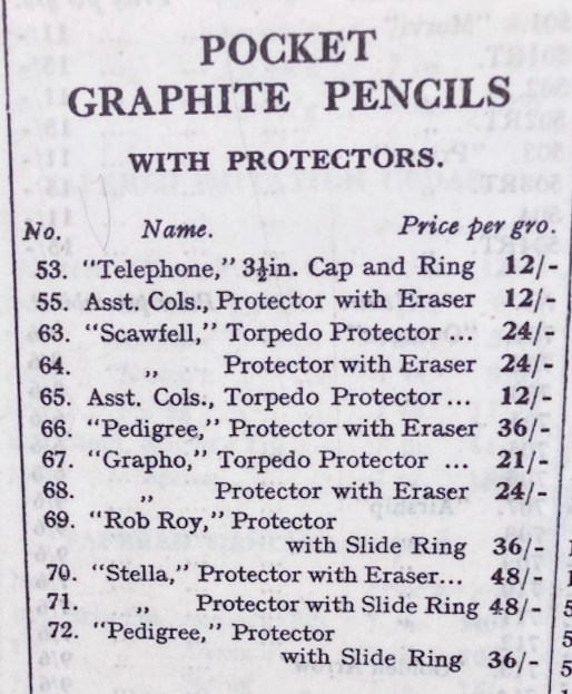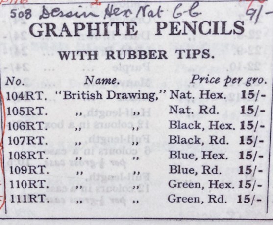 The earlier Floral pencils are noted here. You can spot them in the later catalogue too, but the overall design changed a bit. Cumberland also later introduced the ‘John Peel’ as a more boy orientated version of the Floral, which was initially a girl-focused school pencil.