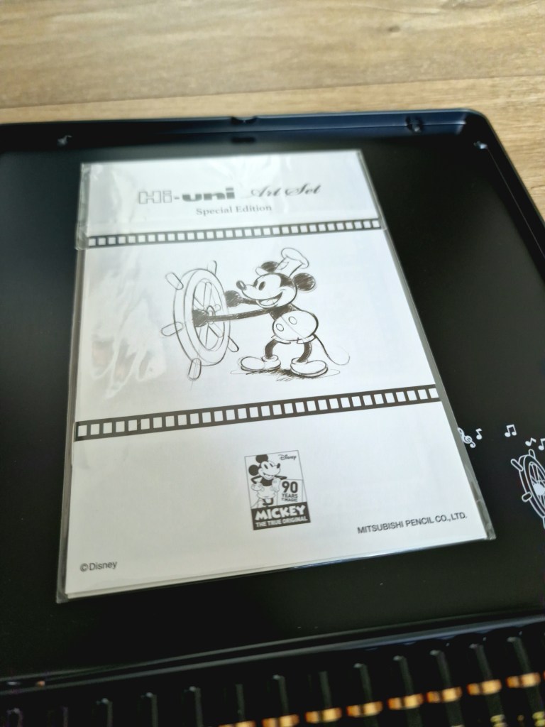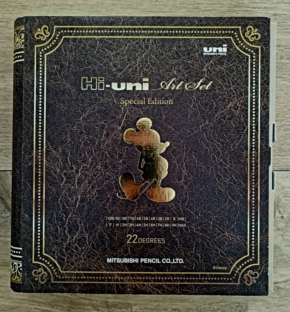 The cardboard slip case is made to look like an old book. Pretty neat. Inside is the standard hi-uni art set tin, but with some fun Disney graphics. I like the Mickey gloves on the corners especially.