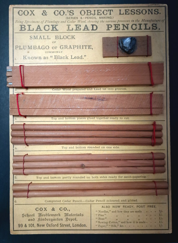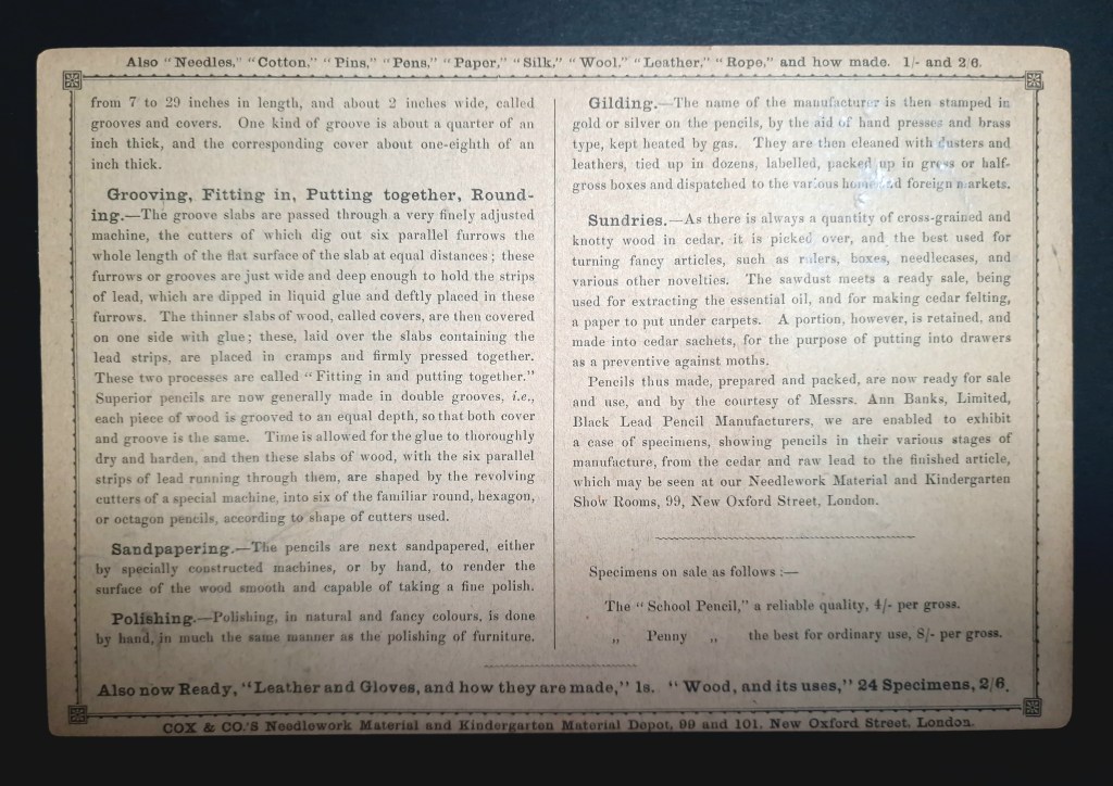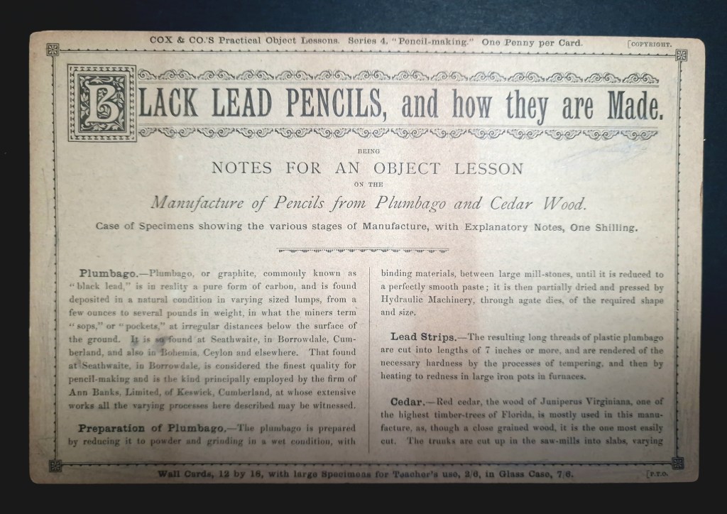 I recently picked up a set of Cox & Co’s Object lessons. The set contained three ‘lessons’: how needles are made, how pen nibs are made, and how pencils are made. Whilst the other two are interesting, it’s the pencil cards that I really bought the set for.