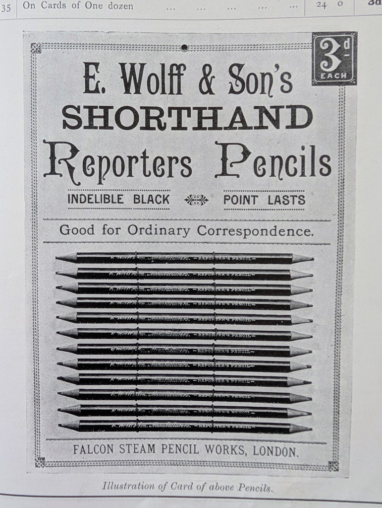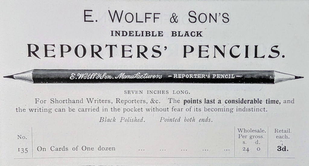 I had a quick look though my hard copy of the earlier wholesale catalogue, and it does appear that even though the ‘Special Shorthand’ was being billed as a new model, there was a similar model released previously: the ‘Reporters Pencil’. The key difference being the Reporters Pencil was indelible.